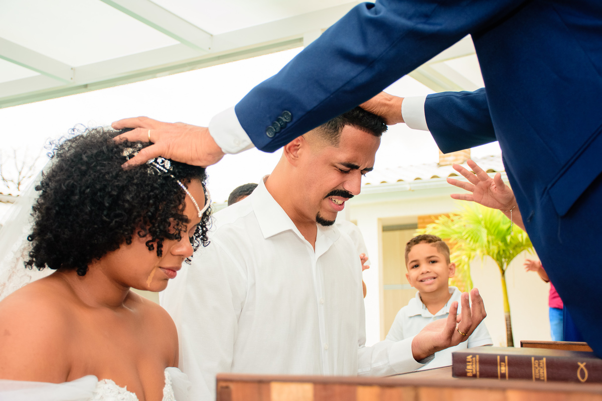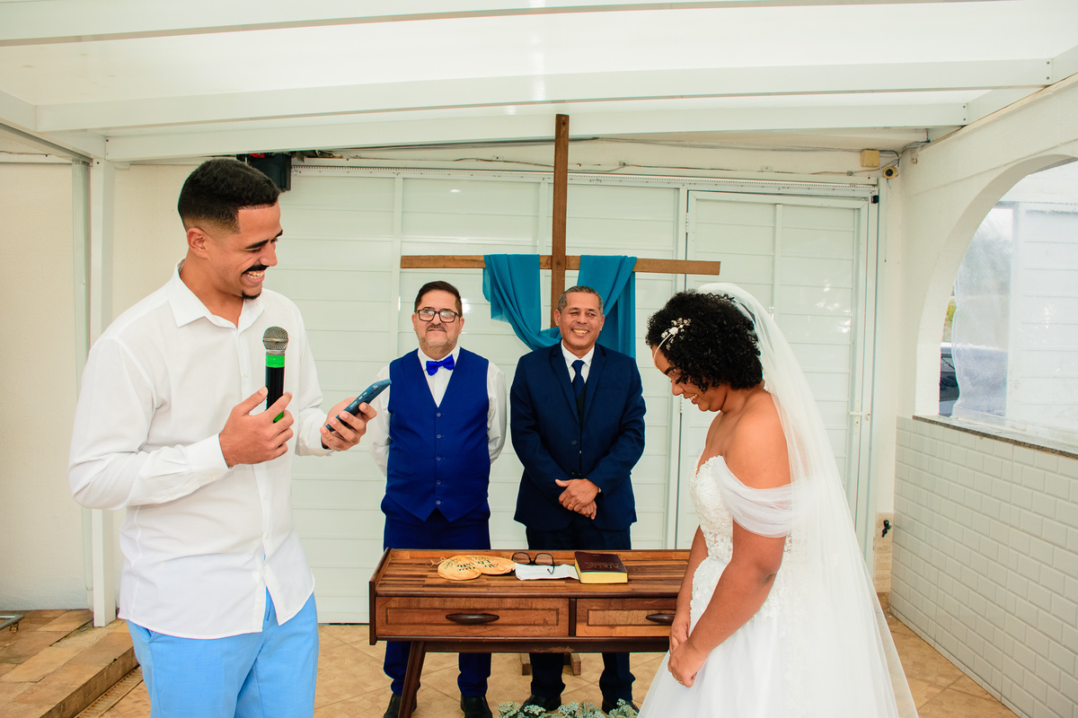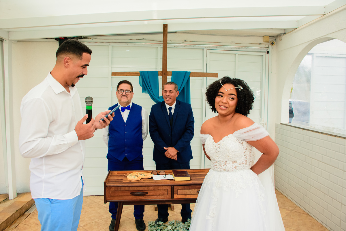 Foram muitas brincadeiras e risos, momentos de emoções dos noivos além da conta, no altar onde tudo é apresentado ao Pai, a gratidão e celebração foi externada por todos naquele ambiente.